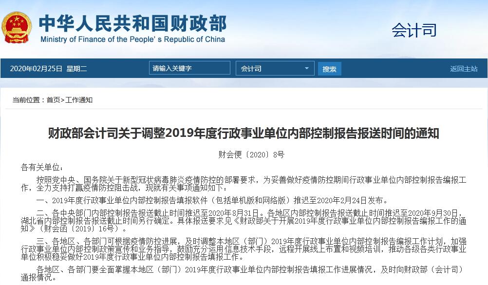 財政部會計司關于調整2019年度行政事業單位內部控制報告報送...